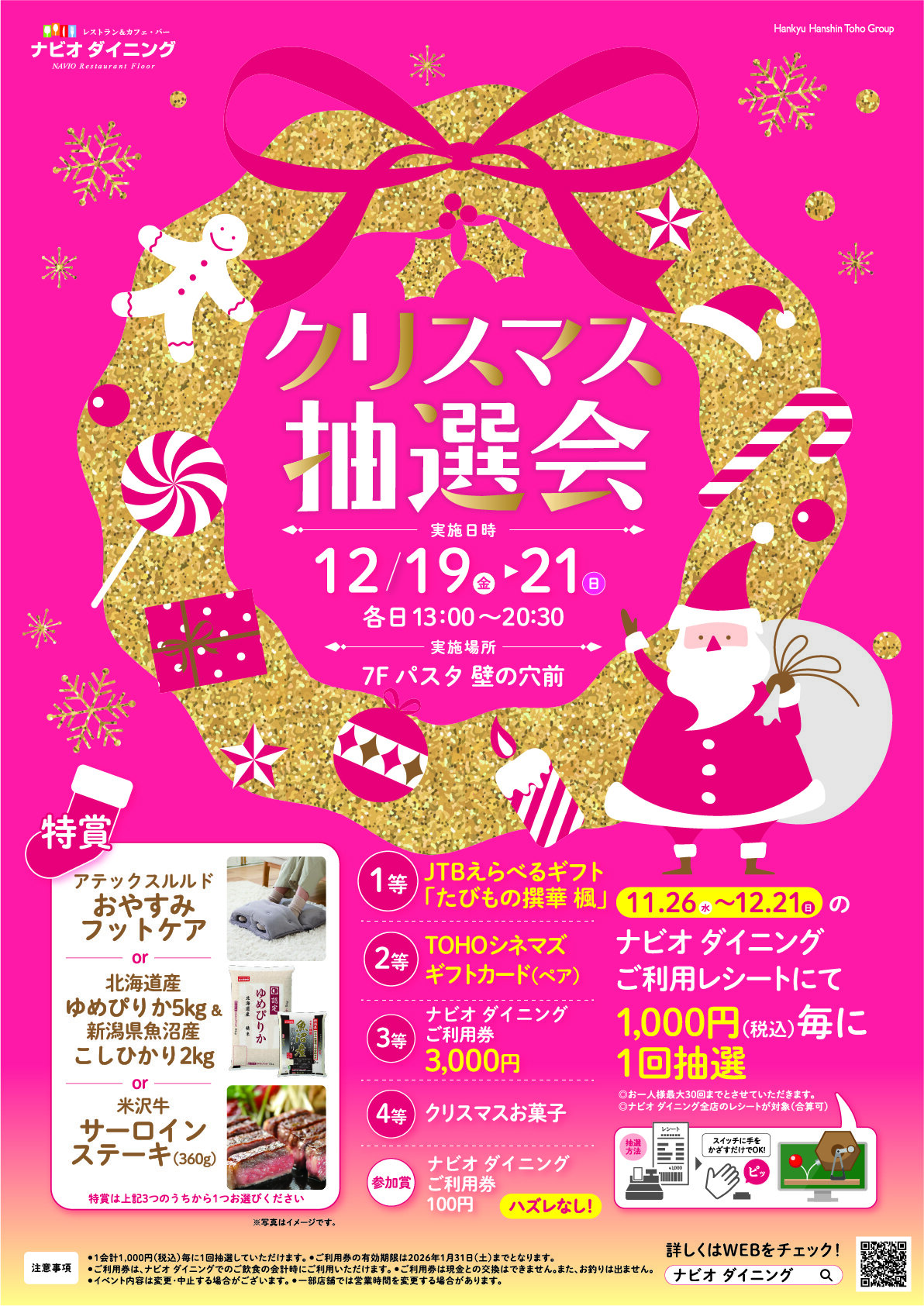 11/26(水)~12/21(日)のナビオ ダイニングご利用のレシートにて、1,000円(税込・合算可)ごとに1回抽選していただけます!